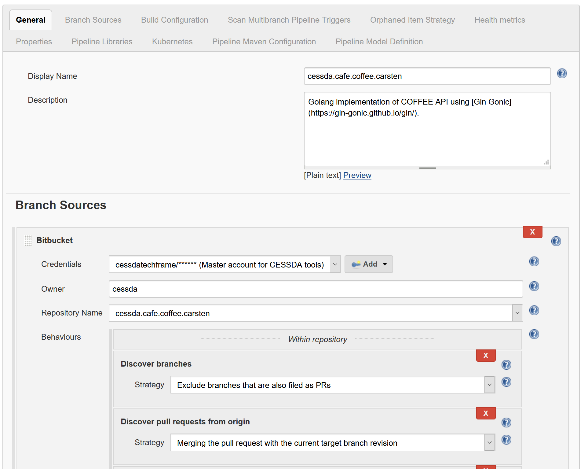 Under Branch Sources select Add Source, then select Bitbucket. Set the credentials to the cessdatechframe account and the owner to cessda. The dropdown list should now populate.
