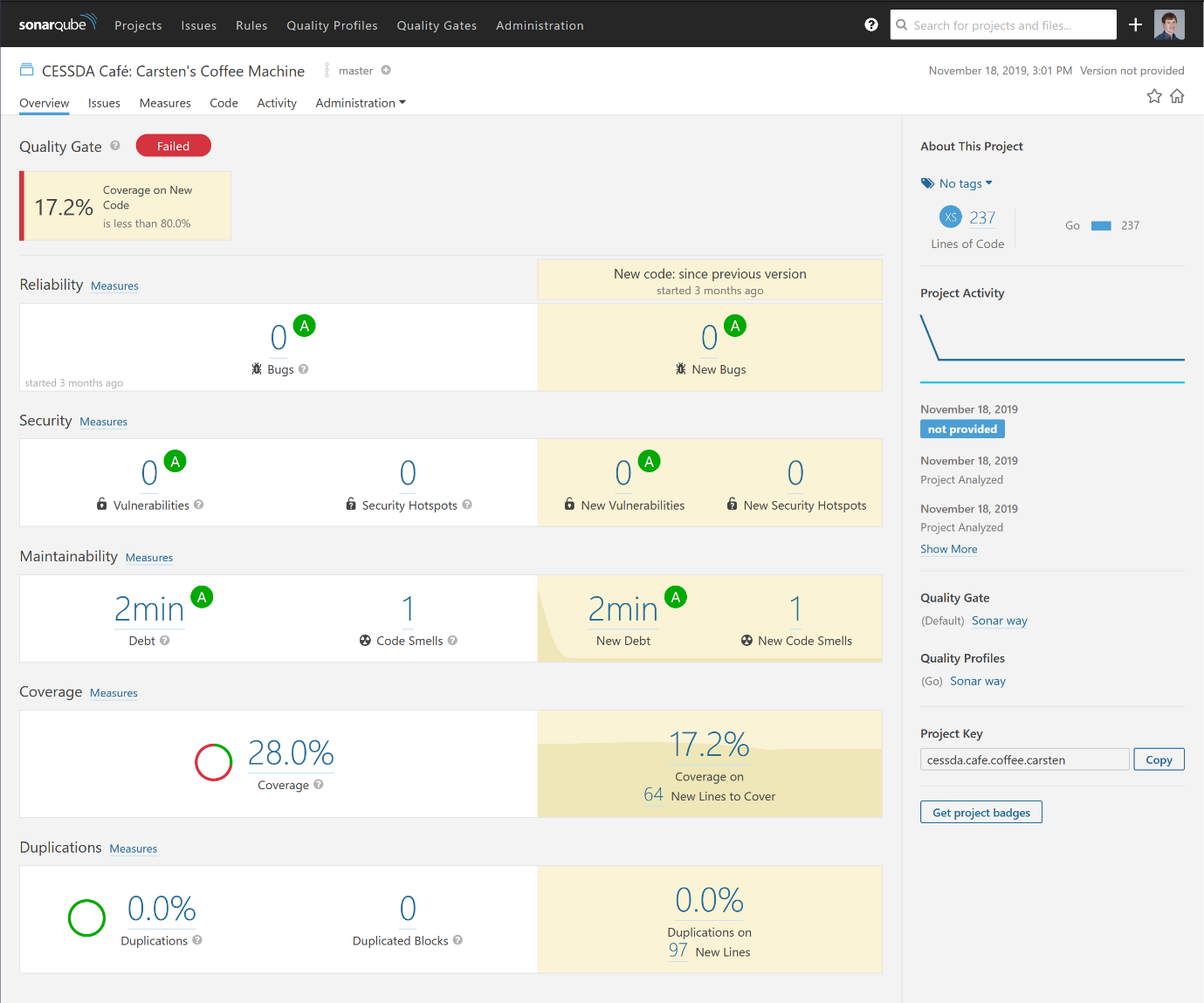 Once an analysis is run navigating to the project page in SonarQube should display a page like the image below.